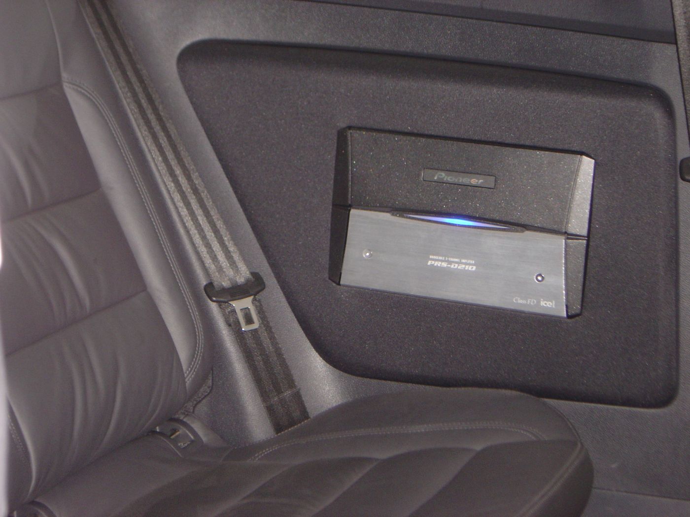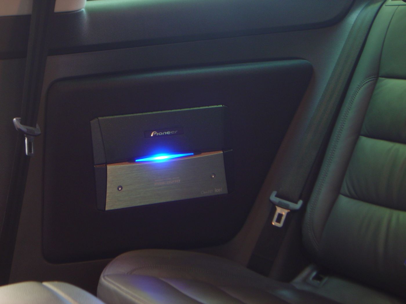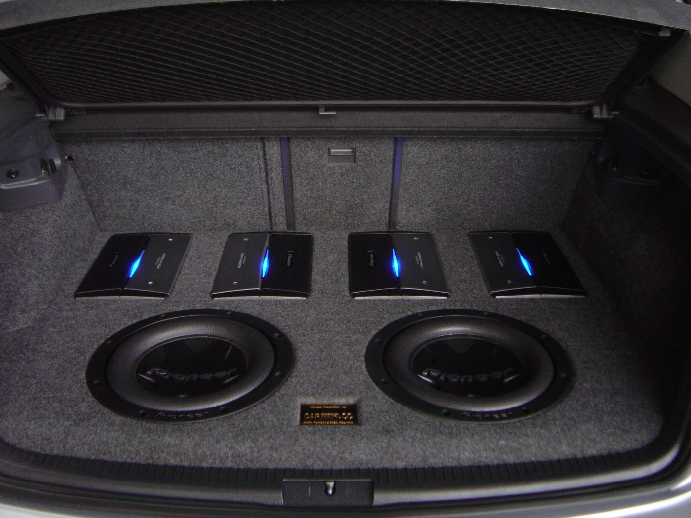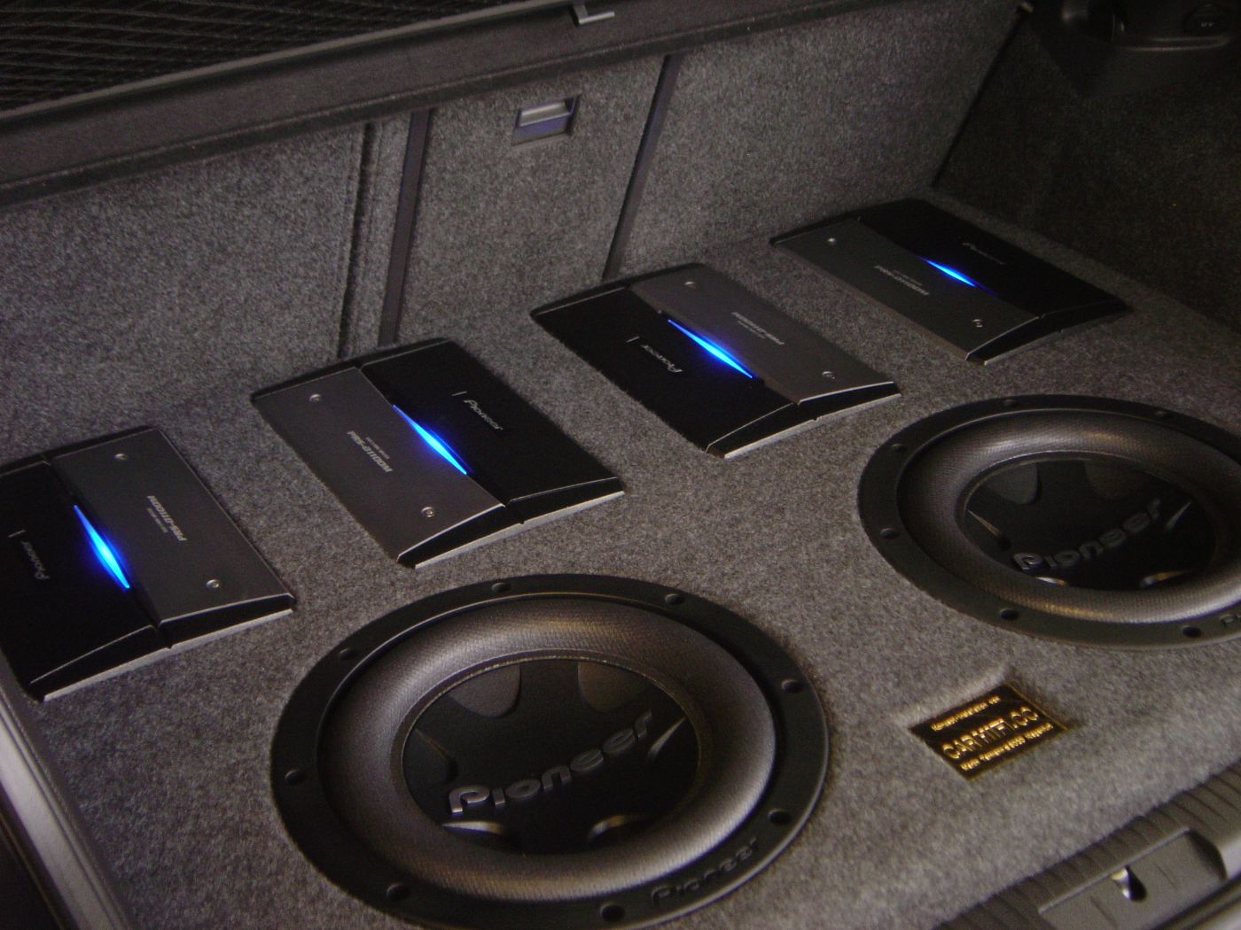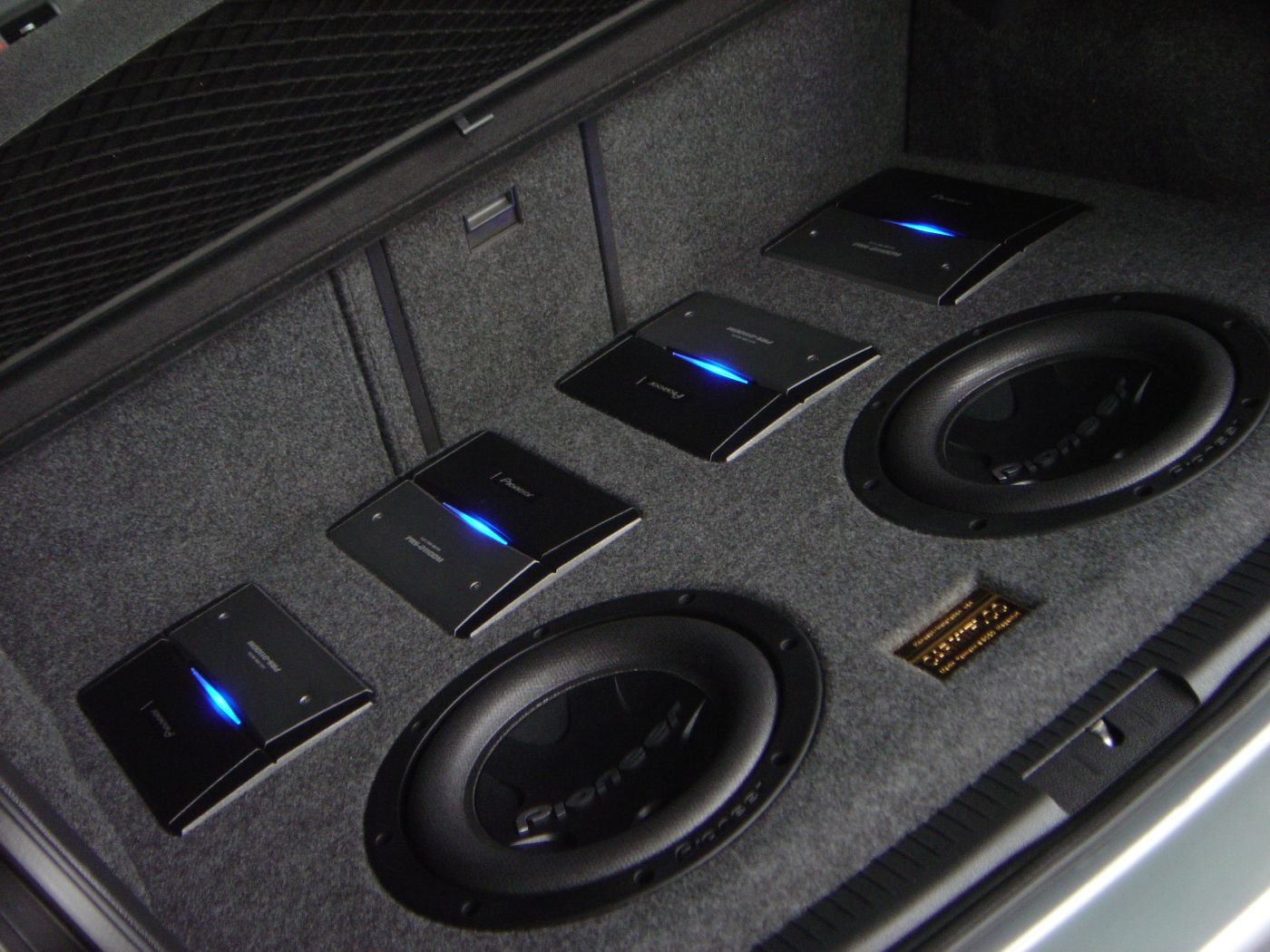 Im Kofferraum wurde ein aufwendiger Ausbau mit zwei Subwoofern und vier Verstärkern umgesetzt. Zusätzlich wurden zwei weitere Verstärker sichtbar in die hinteren Seitenverkleidungen integriert. Ergänzt wird das System durch Monitore in den hinteren Kopfstützen, die optisch wie eine serienmäßige Lösung wirken.
